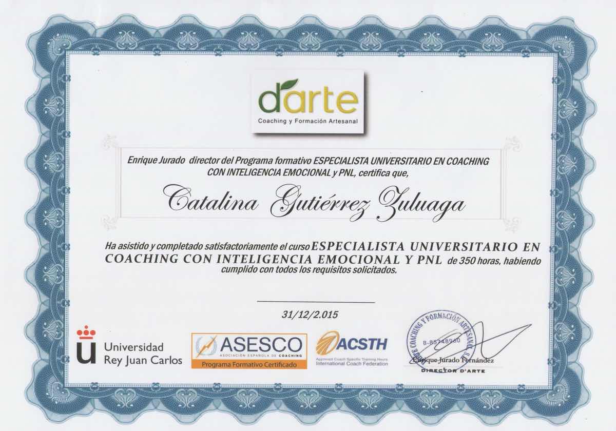 Especialista universitario en coaching con Inteligencia Emocional y PNL. Estos dos diplomas pertenecen al mismo título. Comparto ambos diplomas para dar a conocer las entidades que respaldan el curso y el título. Un año de formación presencial en Madrid, España.