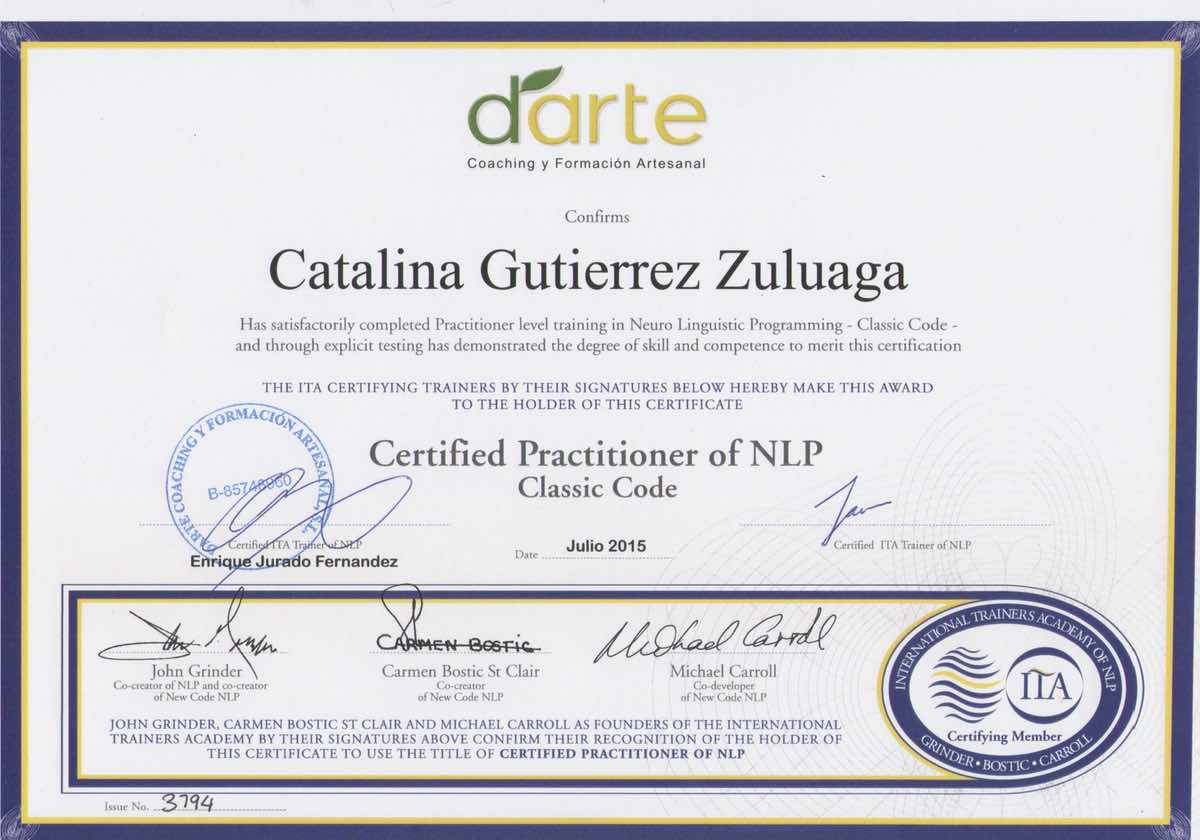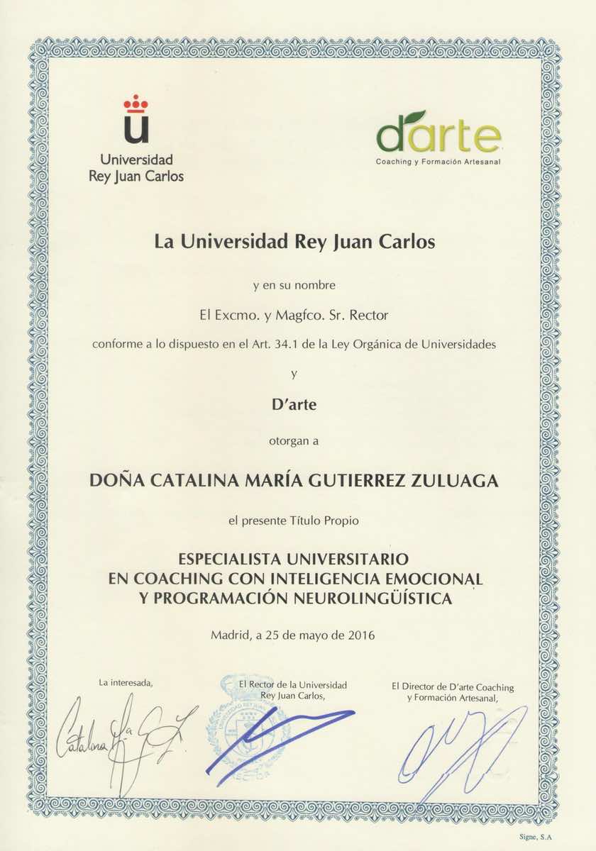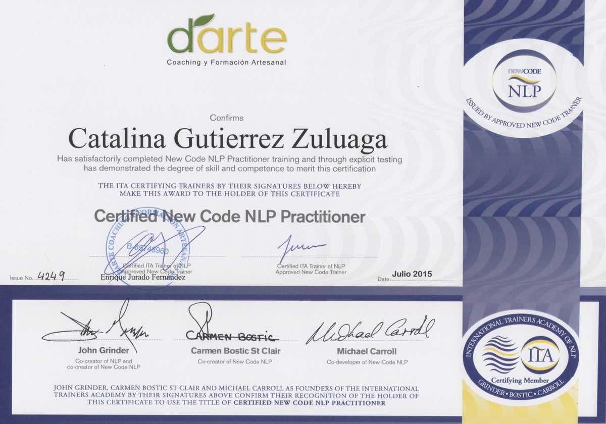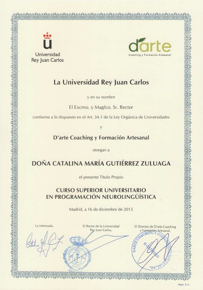 Curso superior universitario en Programación Neurolinguística (PNL). Comparto el diploma de la universidad y el diploma otorgado por la Escuela de formación Darte Coaching en el que se especifica: Practitioner de PNL en Código tradicional y Nuevo código. Madrid, España.